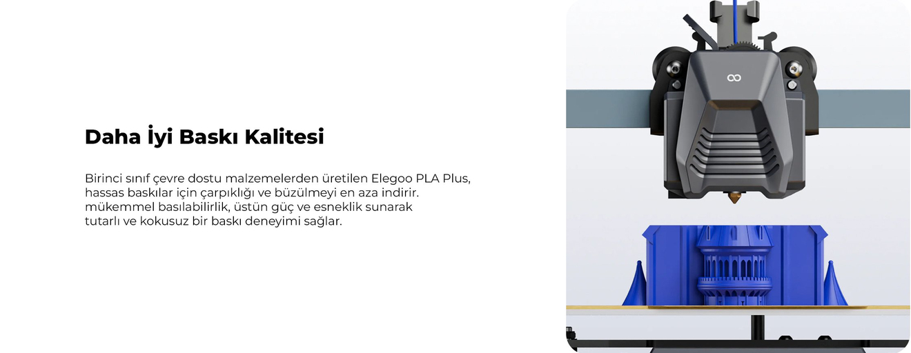 Elegoo PLA Plus, baskı kolaylığından ödün vermez. Optimize edilmiş formülü sayesinde eğilme ve büzülme minimuma indirilir, bu da yüksek hassasiyetli parçalar elde etmenize yardımcı olur. Ayrıca, iyi soğutma özellikleri sayesinde çıkıntılı ve karmaşık geometrilere sahip modelleri daha yüksek başarı oranıyla basabilirsiniz.