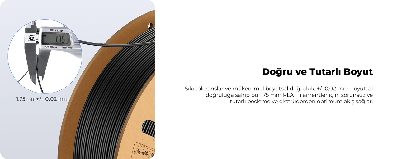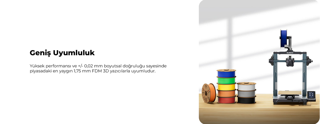 Filamentin güçlü katman yapışma yeteneği, katman ayrılması riskini azaltarak baskı yüzeyinizin daha pürüzsüz ve parlak olmasını sağlar. Stabil boyutları ve düşük baskı sıcaklıklarına uyumu, kaliteli sonuçlar almayı kolaylaştırır.