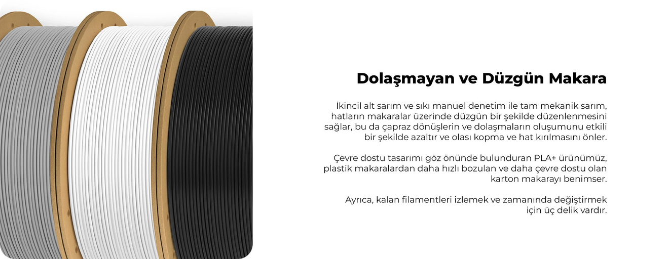 Elegoo PLA Plus makaraları, makine destekli ve manuel kontrol ile düzenli ve dolaşmayan bir sarıma sahiptir. Bu özenli sarım tekniği, baskı sırasında sık görülen çapraz dönüşleri ve düğümlenmeleri büyük ölçüde azaltarak olası hat kopmalarını ve baskı hatalarını önler.